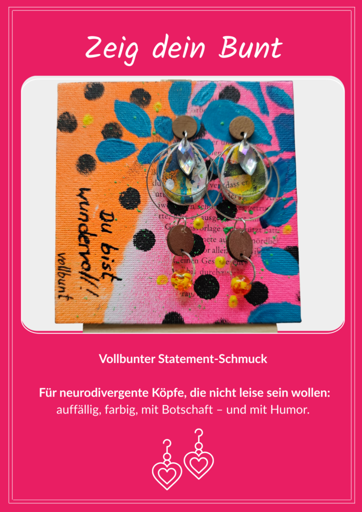 Ich bin Nicole – neurodivergent, voller Ideen und Gefühl, manchmal auch voller Chaos. Genau deshalb gibt’s meine Produkte: als liebevolle Anker im Alltag. Für Farbe im Kopf, Ruhe im Bauch und dieses kurze „Ah… da bin ich ja wieder“.