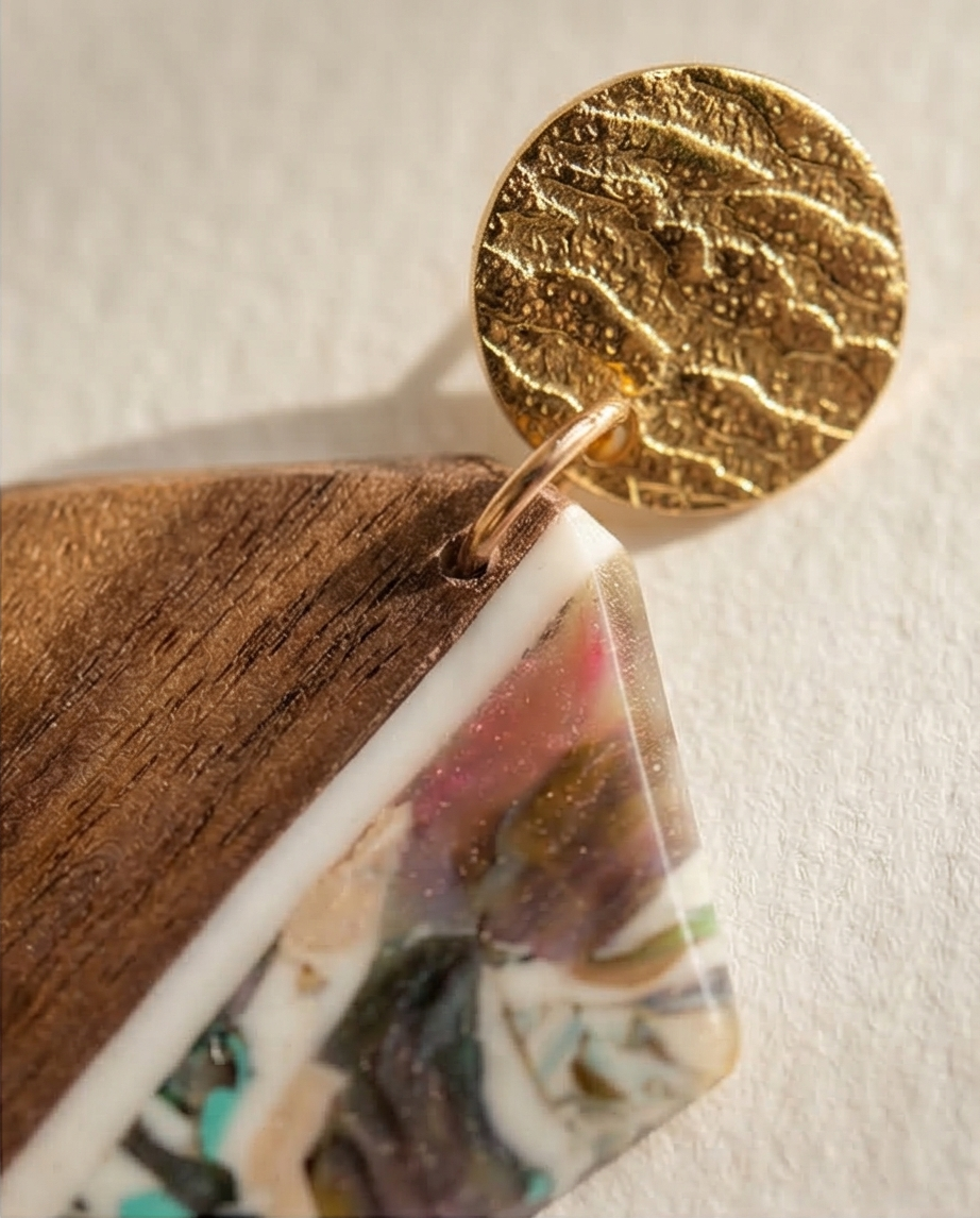 Das Holz wird mit weiteren kreativen Materialien wie modellierter Knetmasse oder klarem Acrylharz kombiniert. Dadurch entstehen einzigartige Schmuckstücke, die Natur, Handwerk und künstlerische Gestaltung miteinander verbinden.