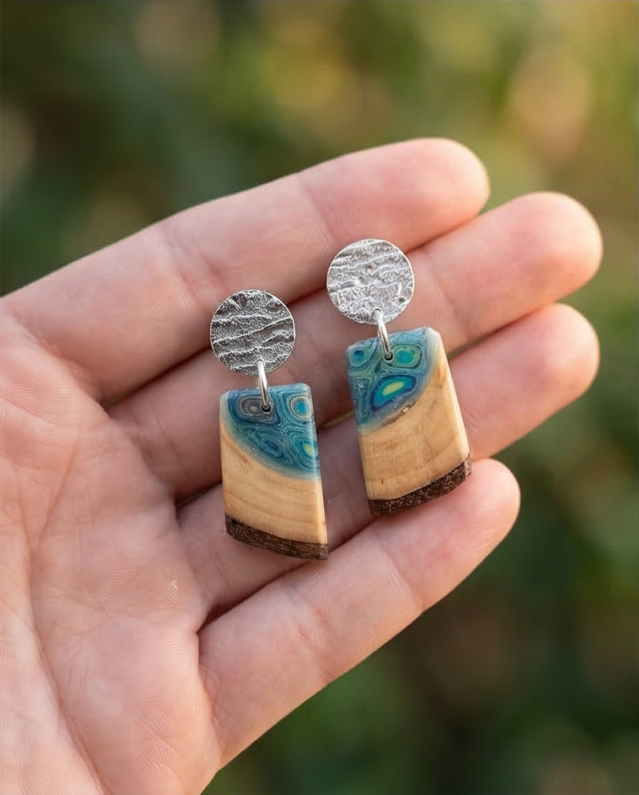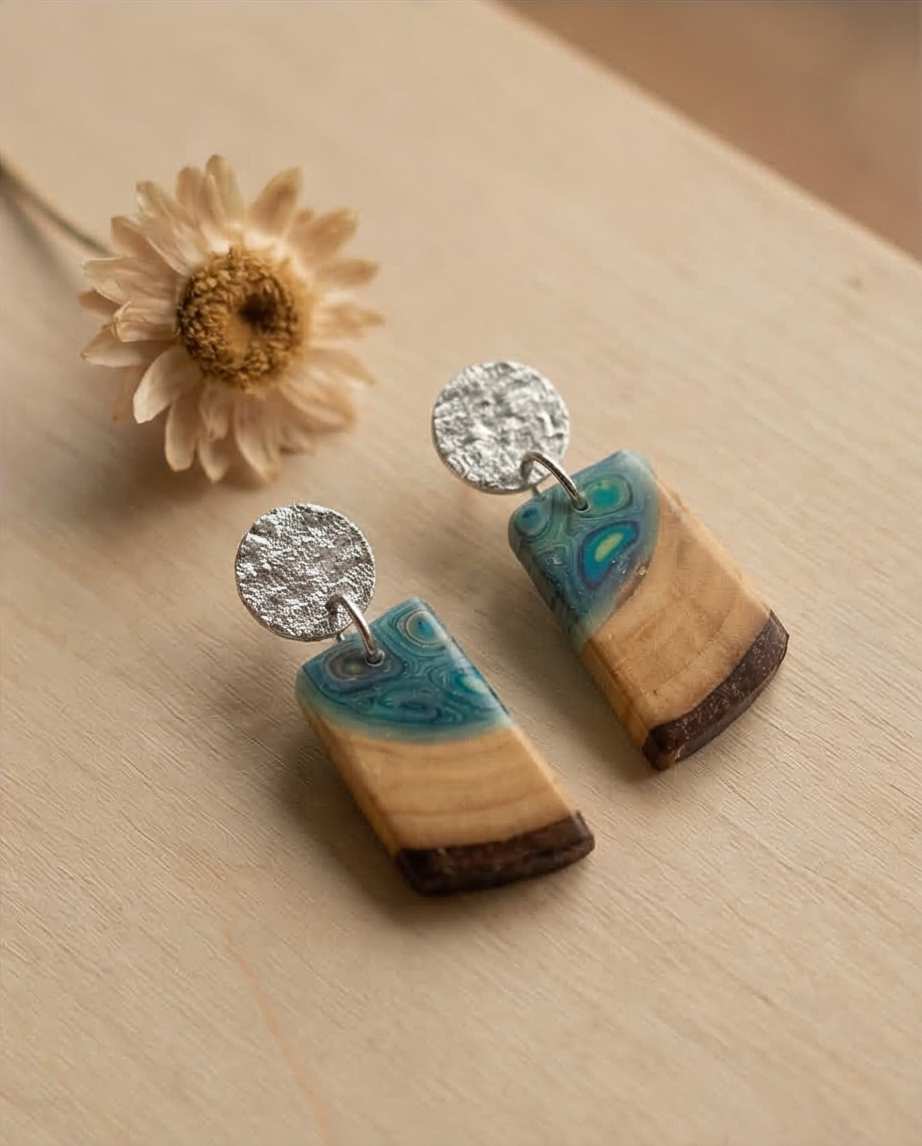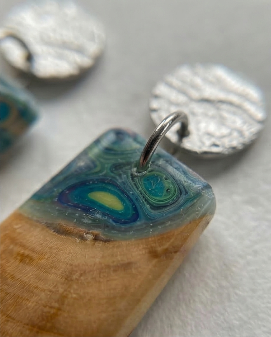 Das Holz wird mit weiteren kreativen Materialien wie modellierter Knetmasse oder klarem Acrylharz kombiniert. Dadurch entstehen einzigartige Schmuckstücke, die Natur, Handwerk und künstlerische Gestaltung miteinander verbinden.
