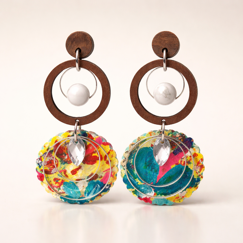 Die Ohrringe werden mit verschiedenen Materialien kombiniert – darunter Holzelemente, Metallringe, Perlen, Strasssteine und weitere dekorative Elemente. Durch diese Kombination entsteht ein lebendiger, künstlerischer Look mit besonderer Tiefe.
