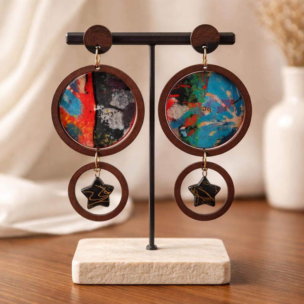 Die Ohrringe werden mit verschiedenen Materialien kombiniert – darunter Holzelemente, Metallringe, Perlen, Strasssteine und weitere dekorative Elemente. Durch diese Kombination entsteht ein lebendiger, künstlerischer Look mit besonderer Tiefe.