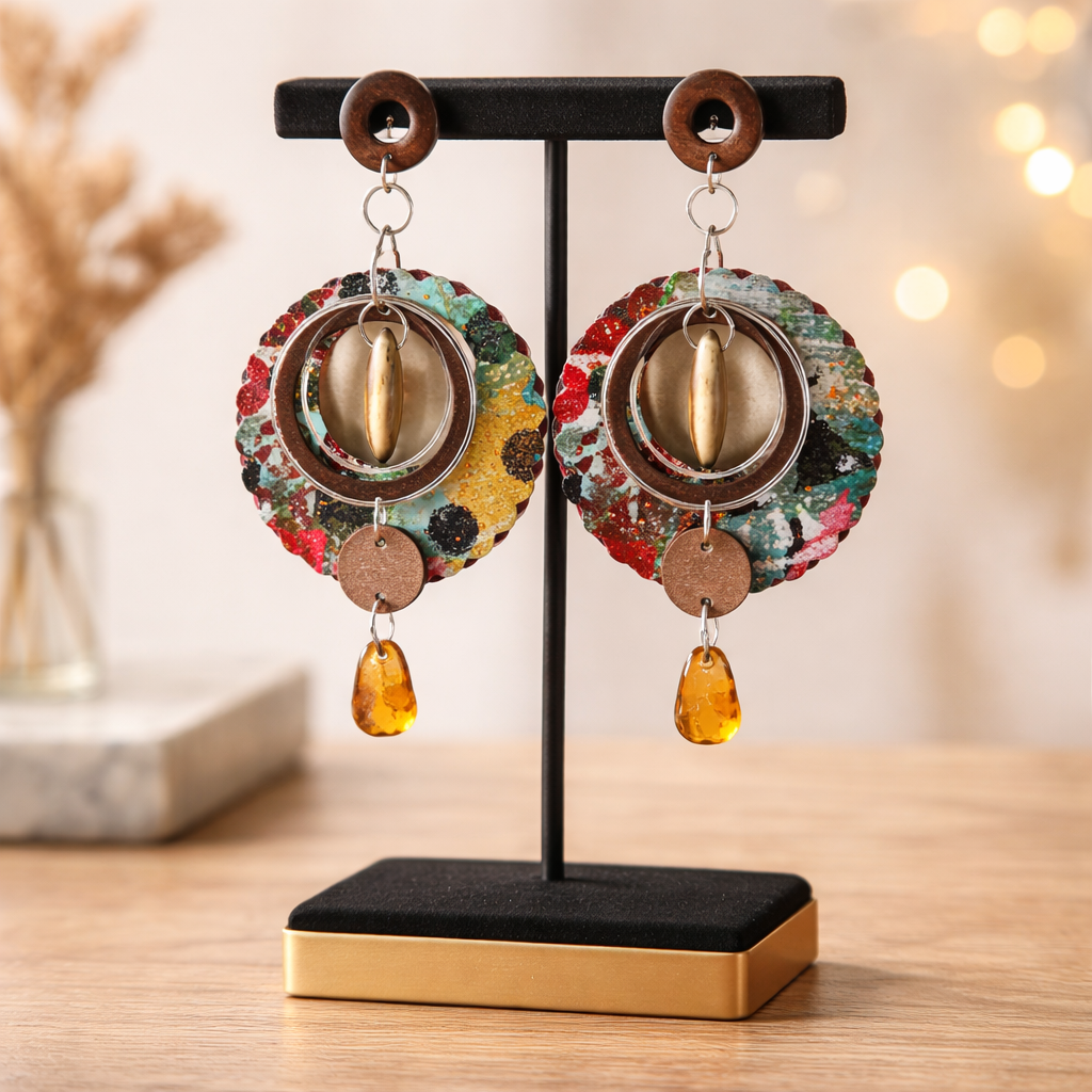 Die Ohrringe werden mit verschiedenen Materialien kombiniert – darunter Holzelemente, Metallringe, Perlen, Strasssteine und weitere dekorative Elemente. Durch diese Kombination entsteht ein lebendiger, künstlerischer Look mit besonderer Tiefe.