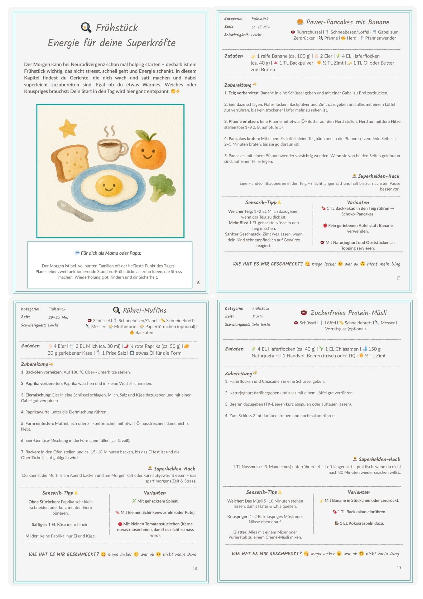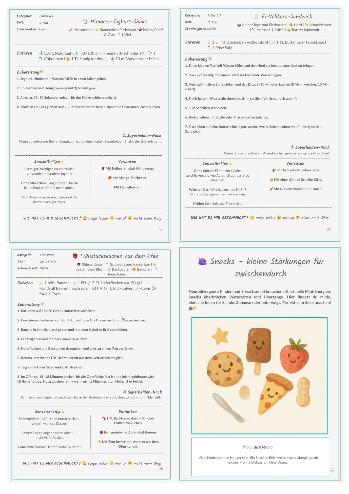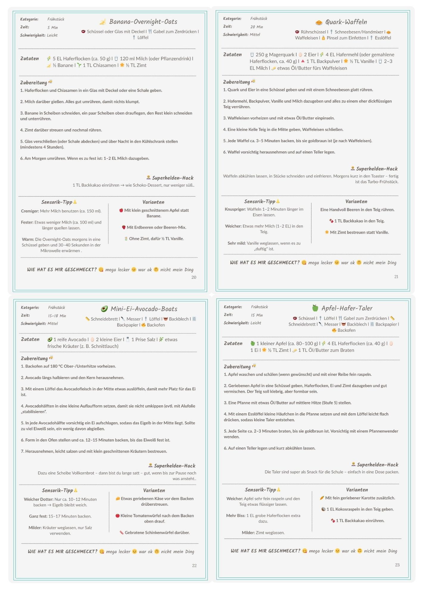 Das Set enthält druckbare Rezeptkarten (Kartenset als PDF), gedacht zum Ausschneiden und Aufstellen – perfekt für den Familienalltag, für wiederkehrende Lieblingsrezepte und für Kinder, die gern mithelfen. Viele Karten haben zusätzlich kleine Hinweise wie „Für dich als Mama“, Varianten, Sensorik-/Alltagstipps und eine simple Bewertung („mega lecker / okay / nicht mein Ding“).