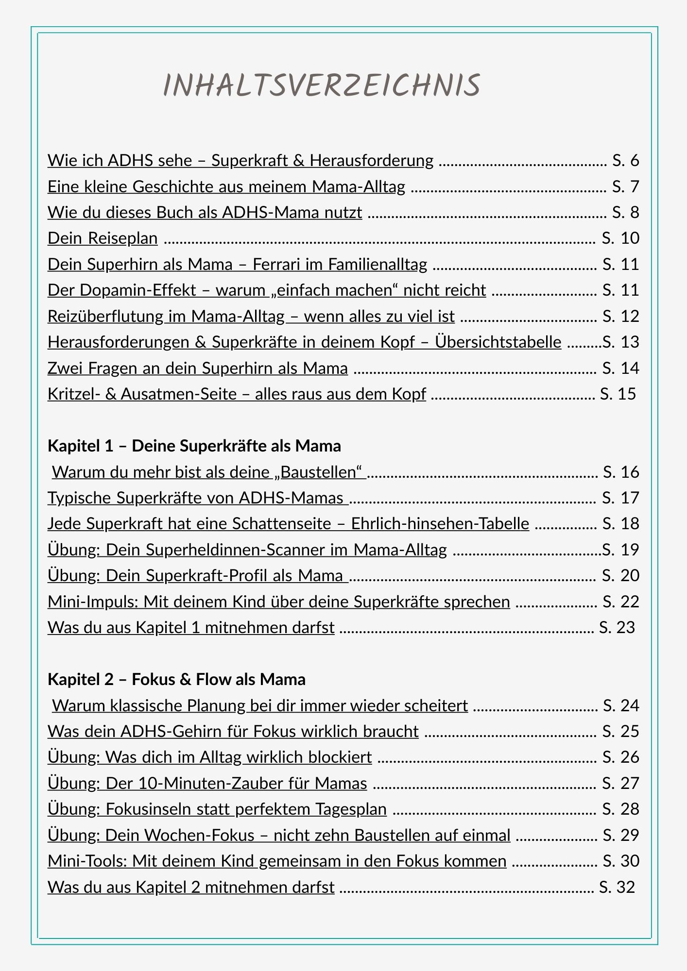 Du bist Mama, hast ADHS – und dein Alltag fühlt sich an wie 50 Tabs im Kopf, während gleichzeitig jemand „Mamaaa!“ ruft? Dieses Workbook ist kein „Reiß dich zusammen“-Gelaber, sondern ein praktischer Werkzeugkasten für neurodivergente Mamas, die wieder mehr Klarheit, Ruhe und Selbstführung in ihr echtes Leben kriegen wollen.